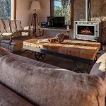 Naast een stenen open haard heeft de gesitueerde in Villa La Angostura Happy Host - Las Nilidas Villa ook een flatscreen TV met satellietzenders.